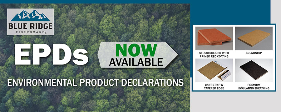 BLUE RIDGE FIBERBOARD, Inc. is committed to providing architects, engineers and contractors with the best quality products possible. It is the mission of BLUE RIDGE FIBERBOARD to not only offer a superior product at a reasonable price but to continue the past tradition of reliability into the low-slope roofing market and soundproofing. For more information or to view the newly published EPDs, visit https://www.blueridgefiberboard.com/green-building/